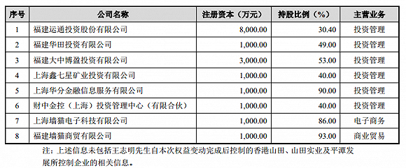 王志明名下控制及参股了不少企业,名单如下: