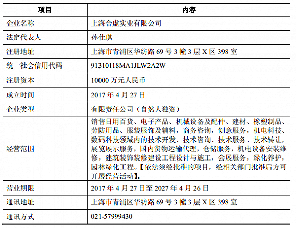 再看孙仕琪的担保公司上海合虚实业有限公司(下称合虚实业)。该公司成立于2017年4月27日,注册资本1亿元,属批发和零售业。