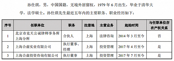 再来看看孙仕琪。资料显示,孙仕琪,毕业于清华大学,法学硕士,其100%控制着上海合虚实业有限公司。