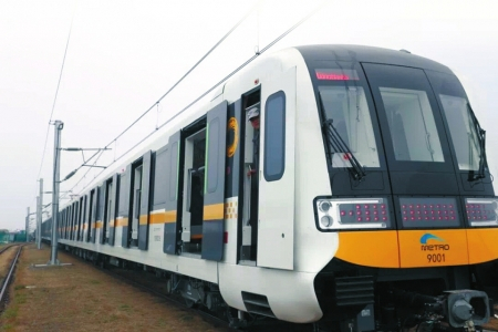 记者在新津中车长客试车线上看到了正在进行调试的9001号列车,即成都地铁9号线的首列车。从外观上看,9号线车辆外观及内饰的主体颜色均为橙色,车体外观造型流畅,前端采用LED灯具搭配点状光源装饰,侧面造型圆润饱满,两侧黄色飘带犹如微笑般微微上扬,亲和力十足。
