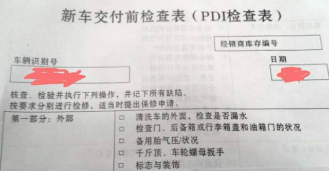 这就不得不了解一个词,叫“PDI检测”,PDI(Pre Delivery Inspection出厂前检查)即车辆的售前检验记录。是新车在交车前必须通过的检查。按照正规的程序,车辆交接的时候是要填写一张至少四十多项《PDI检测表》(售前检测证明)的,如果购买的是高档车,这个程序一般是很正规的。