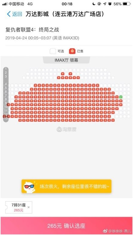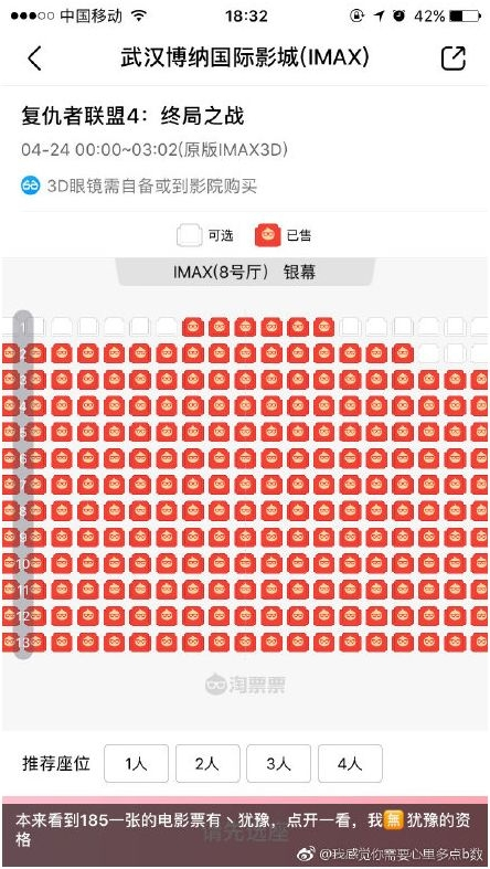 而且票价不仅高,而且还不一定买得到。目前知名影院的 IMAX 基本上座无虚席,即使影院新加开的场次也能迅速售空。对此不少网友吐槽,比春运票还难抢。