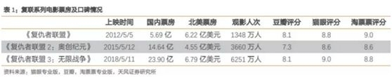 《复仇者联盟》漫威经典系列电影,前三部分别于2012年5月、2015年5月和2018年5月上映,票房和口碑均表现优异。票房方面,三部《复仇者联盟》均为上映当月月度票房冠军,且揽获上映当月近一半票房。据统计,前三部的分别达到5.69亿、14.64亿和23.90亿,观影人次分别为1347.7万、3659.7万和6250.8万。