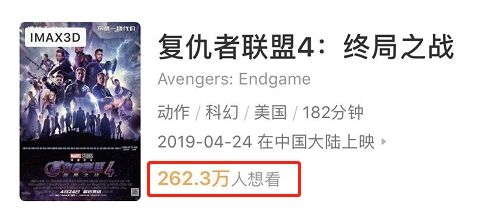 据猫眼和淘票票数据统计,《复仇者联盟4》想看人数遥遥领先于其他电影,这在中国影史上也是新的纪录,淘票票和猫眼数据显示《复仇者联盟4》想看人数合计已超400万人次。