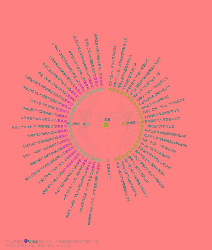 进一步查询启信宝显示,西安利之星的企业类型为外资投资企业分支机构,为外资公司。值得关注的是,由颜健生担任法定代表人的企业多达128家,包括利星行(中国)汽车企业管理有限公司和利星行贸易(中国)有限公司,担任高管139家在担任法定代表人或任职的企业中,多数与利星行相关。这就是说,在诸多利星行旗下的奔驰4S店中,颜健生担任法定代表人,拥有决定性话语权。