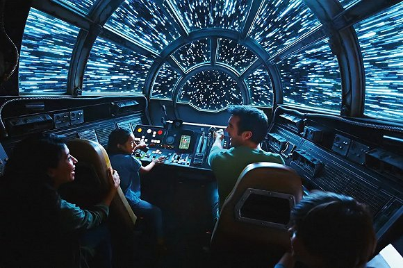 其中一个名为“千年隼号:义军走私者航程(Millenium Falcon: Smugglers Run)”。该项目的座位被设计成千年隼的驾驶舱,内部可以容纳六人——每个人将扮演一个角色,比如飞行员和飞船工程师,并能实际体验驾驶飞船的模拟体验,根据操作水平不同,每次体验都会不同——可能因为驾驶得好被游戏中的任务称赞,也可能导致飞船坠毁。