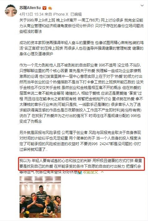 苏醒认为,关于是否愿意付出工作时间有两个核心要素:热爱和回报与风险承担,还表示对年轻人来说,找到自己的热爱并在所能承受的条件下自愿、自由地付出努力最重要。