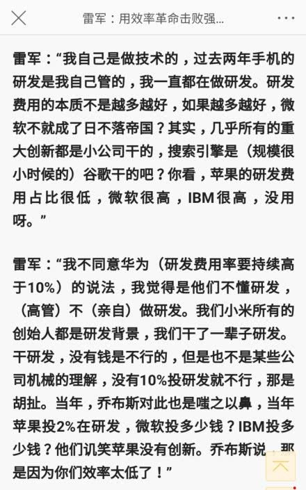 雷军:研发费用并非越高越好 华为高管们不懂研发