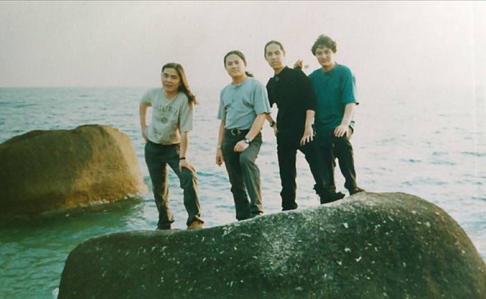 1995年乐队在三亚,从左至右:旺那日松,张港,范俊义,那日苏。