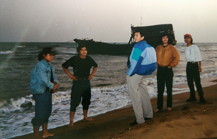 1993年底在海口的海边,范俊义和乐队的朋友们,从左至右:张港,旺那日松,郝军,那日苏,范俊义。