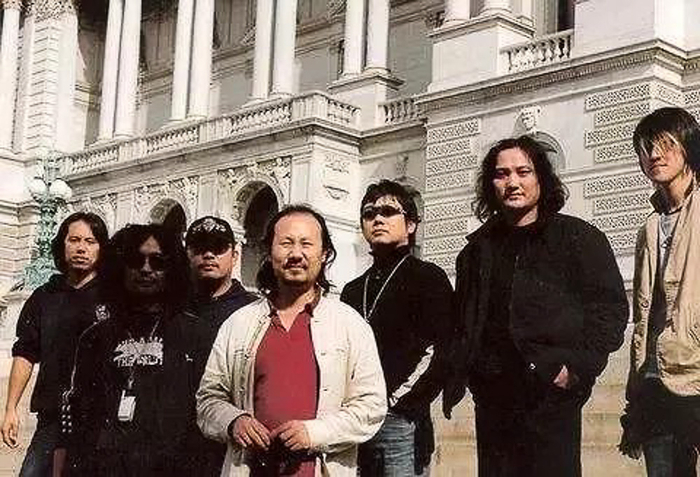 2004年,苍狼乐队在美国,从左至右:范俊义,贝尔,刘晓光,腾格尔,张全胜,那日苏,荒井壮一郎。