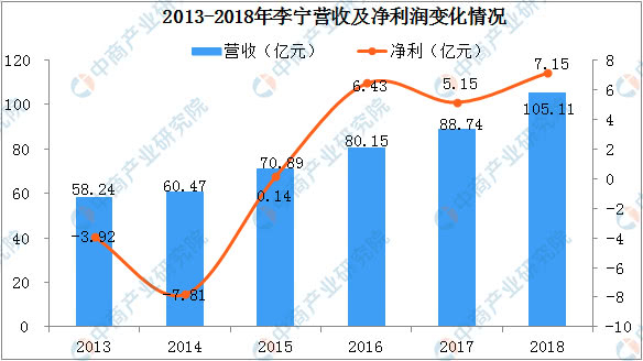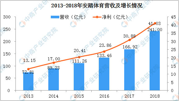 中商情报网讯:近年来,国家大力支持体育产业的发展以及全民健身热度的不断升温为中国体育产业提供了广阔的市场容量,作为体育产业发展的基础分支的体育用品业也藉此实现快速发展。中国已成为世界最大的体育用品基地,体育用品行业也逐步进入稳定增长的成熟期。数据显示,2013-2017年我国体育用品行业收入和利润都在不断增长,五年年均复合增长率分别为7.64%和9.37%,增长十分迅速。2018年对于运动品牌来说更是一个丰收年。据各运动品牌2018年财报显示,安踏以营收241亿元、净利润41.03亿元稳居榜首,超过李宁、361度、特步三家之和。