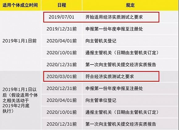 2019年之前成立的老企业,应在2019年7 月1日前满足经济实质要求;2019年之后成立的新企业,应在设立1年内满足经济实质要求。