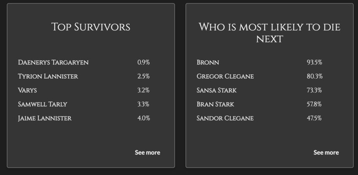 根据算法,龙妈Daenerys Targaryen(丹妮莉斯·塔格利安)生存的几率最高,达到了99%,小恶魔Tyrion Lannister(提利昂·兰尼斯特)也有97%的存活率。