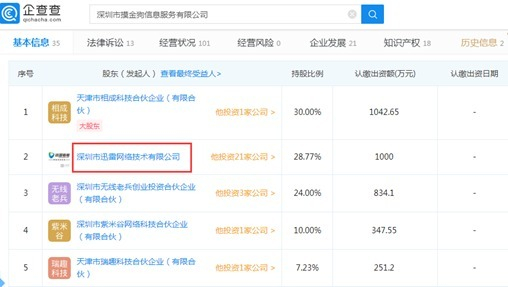 2017年12月,本次事件以迅雷大数据公司更名握手言和。《每日经济新闻》记者通过企查查网站查询发现,现深圳市摸金狗信息服务有限公司,曾用名即为“深圳市迅雷大数据信息服务有限公司”,在所有股东中,深圳市迅雷网络技术有限公司认缴金额1000万元,持股比例28.77% ,仅此于第一大股东天津市相成科技合伙企业(有限合伙)30%的比例。