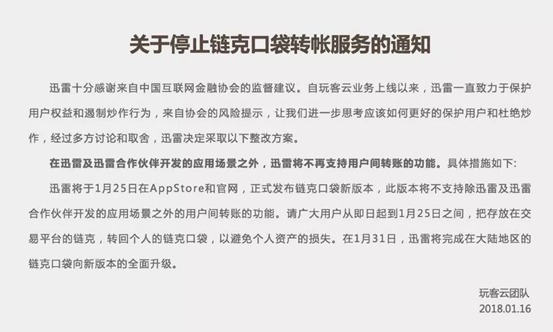 对此,迅雷玩客云团队随后发布公告称,决定在迅雷及迅雷合作伙伴开发的应用场景之外,将不再支持大陆用户间转账的功能。