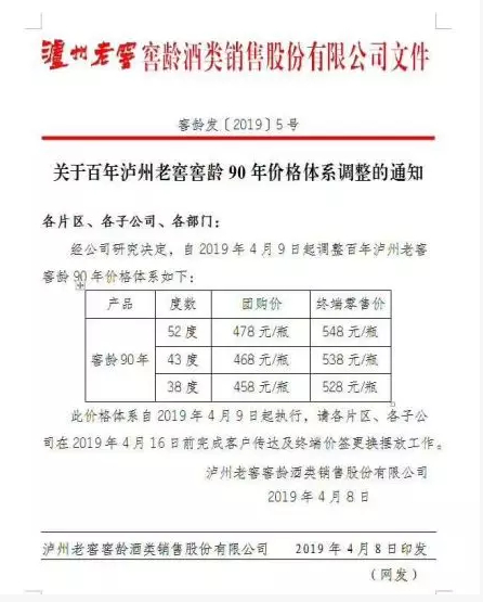 4月8日,泸州老窖窖龄酒类销售公司也发布了提价文件,要求对百年泸州老窖窖龄90年产品的价格进行调整。其中窖龄90年52度终端零售价548元/瓶,团购成交建议价478元/瓶。而泸州老窖的核心产品,国窖1573经典装则是今年1月宣布调整价格:酒行供价建议810元/瓶;团购价880元/瓶;零售建议价1099元/瓶。并表示鉴于国窖1573的产能呈现饱和,2019年1月,52度国窖经典装产品配额扣减20%执行。