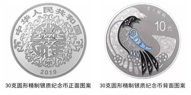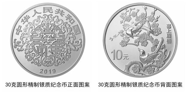 30克圆形银质“喜上眉梢”纪念币背面图案为喜鹊与梅花等组合图案,并刊“喜上眉梢”字样及面额。