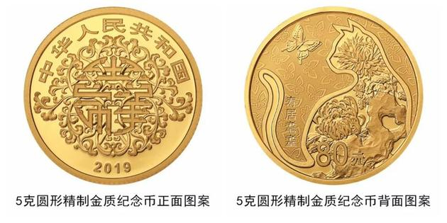 5克圆形金质“寿居耄耋”纪念币背面图案为寿石、吉祥花卉、猫、蝴蝶等组合图案,并刊“寿居耄耋”字样及面额。