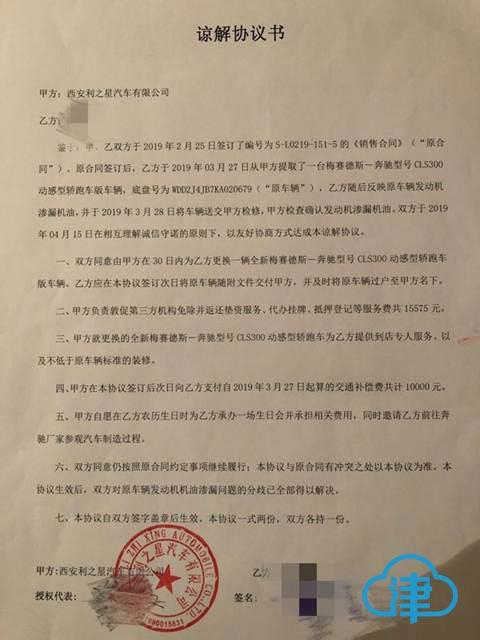 4月17日凌晨,奔驰女车主向记者表示,她对处理结果感到满意。双方的和解协议主要包括5项:首先,30日内利之星为其更换同款同色奔驰新车,沿用贷款方式购买;其次,责令第三方(即陕西元胜公司),将此前收取的1.5万余元垫资服务费(金融服务费)、代办挂牌费、抵押登记费全额退回;享受奔驰终身VIP服务,包括美容级保养、维修等,利之星向车主支付自2019年3月27日算起的交通补偿费1万元。