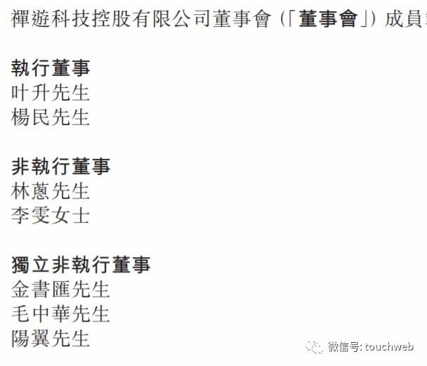 禅游科技执行董事为叶升、杨民,非执行董事为林葱、李雯,独立非执行董事为金书汇、毛中华、阳翼。