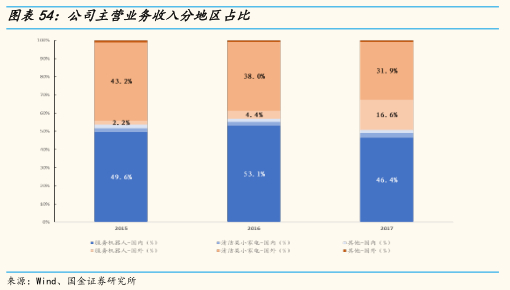 “先难后易”国际化战略,服务机器人产品在海外亚马逊平台销售实现爆发式增长:公司自2012年开始逐渐开展海外销售渠道的布局,采取“先难后易”的国际化战略,即先进入市场成熟、竞争激烈的发达国家市场,后进入发展中国家市场。公司于12年先后成立德国、美国境外销售子公司,14年在东京成立日本销售子公司,形成了以中国为核心,德美日协同发展的研发销售体系,随后成功开拓了英国、法国、西班牙等多个国家和地区的市场,逐渐扩展国外销售渠道。随着“科沃斯”品牌海外知名度的逐渐提高,2017年公司服务机器人产品在海外亚马逊平台销售实现爆发式增长,拉升了整体海外销售。2017年国外服务机器人业务的营收迅速提升至7.56亿元,占比由16年的4.4%提高到16.6%。清洁类小家电业务则主要面向海外市场,且多为代工产品:由于代工产品技术含量及毛利率较低,公司逐渐改善产品结构,向毛利率较高的服务机器人业务转型。