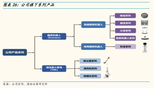 产品线将沿横向(品类丰富)和纵向(产品进化)两个方向延伸:经过二十年的发展,公司逐渐形成“科沃斯(Ecovacs)”、“泰怡凯(TEK)”两大品牌。其中,“科沃斯”品牌主营服务机器人产品,产品系列布局广泛,包括扫地机器人“地宝”、擦窗机器人“窗宝”、空气净化机器人“沁宝”以及管家机器人系列,并积极投身商用服务机器人“旺宝”的生产研发,已于2015年推出第一代商用服务机器人。在清洁类小家电方面,公司主要是为国内外知名吸尘器品牌提供代工服务,自有品牌“泰怡凯”产品主要为吸尘器、清洗机和除螨仪等。