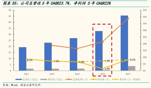 剔除偶发因素,营收业绩增长趋势明显: 2017年,公司总营业收入为45.51亿元,同比增加38.89%,13-17年CAGR为23.7%,营收保持稳健增长。由于2016年对员工股权激励产生股份支付费用,计提1.89亿元管理费用,公司16年净利润同比减少70.49%,净利率仅为1.6%。剔除股份支付费用影响后,16年净利润为2.41亿元,净利率修复为7.4%,5年CAGR为22.0%,呈上升趋势。