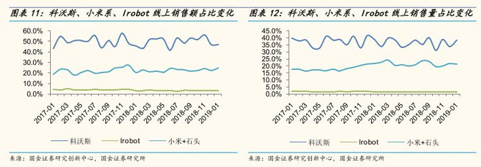 小米抢占外资及其他外资品牌市场份额,对科沃斯的销量和销售额数据不形成直接冲击。我们抓取了阿里系和京东系线上销售从小米和科沃斯的两年竞争格局来看,小米系(石头加小米)的线上销售额市占呈现缓步的增长趋势,从2017年1月的18.5%到2019年1月的25%,但并没有影响科沃斯整体的市场份额情况。科沃斯近两年的线上份额维持在43%-57%之间波动。而IRobot和其他品牌的日子并没有那么好过,Irobot的线上份额从4.6%跌到3%,其他品牌整体市场份额从34%跌到25%。