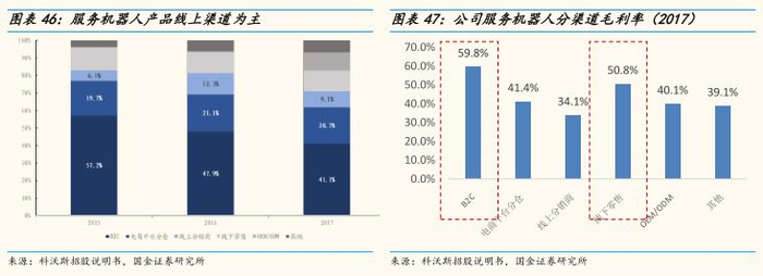 线上线下的公司自营模式毛利率最高。从毛利率差别可看到,公司服务机器人业务自营线上B2C渠道的毛利率最高(59.8%),线上分销商的毛利率最低(34.1%),因此加大线上B2C业务的占比是营销的重点。目前B2C模式的占比达到41.1%,电商平台20.7%,线上分销商9.1%,合计线上渠道占比70.9%,这和扫地机器人产品在我国9成以上的线上销售占比模式也符合。OEM/ODM的占比从2016年0.4%上升到2017年的10.3%,主要是代工模式销售海外。