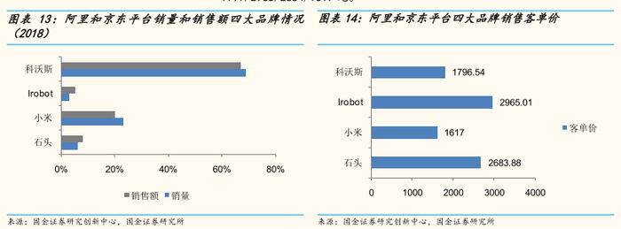 在阿里和京东电商平台,科沃斯2018年的线上销量分别为小米系和IRobot的2.4倍和26倍,销售额分别为这两者的15倍和2.4倍。这进一步论证了科沃斯在线上平台的绝对优势。在只考虑CR3(即科沃斯、小米和石头、IRobot)的线上销量情况下,阿里系和京东系作为国内电商的主要平台,我们选取这两个平台作为样本,发现科沃斯的销售额和销量占比具有绝对性的优势地位。而客单价角度,科沃斯以高性价比优势获取销量,在阿里和京东平台科沃斯、IRobot、小米和石头的平均客单价分别为1797/2965/2684/1617元。
