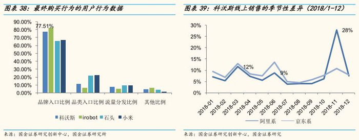 扫地机器人的消费者本质上是一个追求高性价比、具有尝鲜性但偏功能理性、品牌意识较强的群体。扫地机器人的用户购买行为来看,注重品牌效应,7-8成消费者直接搜索“科沃斯”或“IRobot”品牌购买产品。同时,消费者容易受到季节性营销事件的影响。跟随318、618和双十一、双十二的电商销售频率,消费者购买扫地机器人的销量具有极强的季节性,以阿里系为例,3月、6月和11月分别占到科沃斯全年销量的12%、9%和28%。
