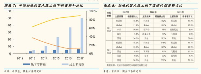 智能产品的发展不是一蹴而就的。技术驱动和产品升级带动供给侧的释放,电商渠道大力助推扫地机器人享受线上流量红利。从第一台扫地机器人由伊莱克斯专业家电制造商问世,距今不过22年时间。2002年,随着Irobot军工机器人企业转型家用市场,整个扫地机器人行业进入商业化阶段。我国扫地机器人行业真正出现爆发式增长是在 2013 年之后。这其中有四方面的因素影响:一是经济能力提升和消费升级带来的需求释放,二是算法的技术进步推动产品实用性和体验感得到较大提升;三是国内市场主要玩家基本在 2013 年左右才陆续完成中国市场布局。国内龙头科沃斯扫地机器人产品于 09 年上市并予以力推,全球龙头 iRobot 于2011年进入中国。四是电商渠道快速兴起,扫地机器人自规模增长以来,线上始终是其最主要出货渠道。