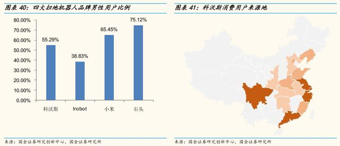 从线上消费者画像来看也能佐证这一结论。科沃斯、小米和石头都是男性占主导购买行为,而客单价偏高的IRobot女性消费者占六成。年龄上来看,30-39为主力军,在四个品牌中均占据约半数的消费群体。地域上来看,科沃斯、小米和石头的消费区域在一线城市占据两成比例,一二线整体超过半数比重,而IRobot一二线城市比重最高八成。科沃斯的消费用户排名主要来自江苏、广东、浙江、上海和四川,这五大来源地贡献了线上四成的收入来源。