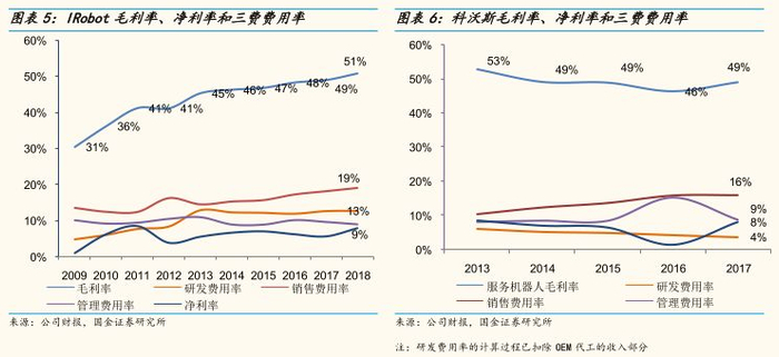 IRobot是“技术研发桥头兵”,科沃斯是“市场红利收割者”,不同的技术投入和营销策略决定了中国竞争市场格局下科沃斯更有突出重围的机会。对比两家公司的销售费用、研发费用和管理费用来看,扫地机器人这个品类本身即是在高毛利的基础上,以极强的品牌溢价推动营销带动收入,因此IRobot和科沃斯的销售费用率都是三费中最高的,分别为19%和16%。但从研发角度,IRobot的研发费用率自2013年起就稳定在12-13%,2018年的研发投入达到约10亿人民币,而科沃斯的研发费用率近些年随着收入增长而下滑,2017年为约4.8%(研发费用率的计算过程已扣除清洁小家电和服务机器人中OEM/ODM代工的收入部分,若不扣除的话研发费用率约3%),即1.24亿人民币,几乎只有IRobot的十分之一。因此,IRobot是依赖高销售费用率和高技术研发投入形成机器人产品的技术驱动和品牌溢价,而科沃斯在技术上的研发更多是将技术应用与中国市场的实际需求结合起来进行算法上的升级,更关注的是品牌营销上的高性价比策略,在中国市场低渗透率的阶段以高性价比在消费者市场形成品牌认知。最终费用率的变化体现在盈利能力指标上,IRobot和科沃斯的营业利润率分别为9.69%(2018)和9.9%(2017)。