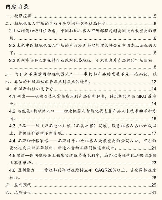 公司核心竞争力:研发——1)从核心技术掌握应用到产品分布种类,科沃斯的产品SKU最为全。2)智能化+物联网入口——扫地机器人智能化代表着产品未来技术的革新方向。3)产品——纵(产品进化)横(品类丰富)发展,服务机器人占比六成以上,量价提升逻辑不断兑现。4)品牌和价格策略——品牌对于扫地机器人是最重要的分发入口,市占的变化也向头部品牌倾斜,新进入者的品牌门槛逐步提升。5)渠道—国内依赖线上销售渠道维持高毛利率,海外以高性价比战略拓展线上零售市场。6)盈利能力——营收和利润增速维持五年CAGR20%以上,资金周转速度加快。