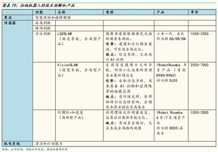 扫地机器人的核心技术拆解分为三部分:算法、传感器和机电系统。1)算法的作用是做智能规划,包括规划线路和避障解困。2)传感器包括距离判断、障碍判断和方位判断。其中方位判断最为重要,主要集中在三个不同的技术应用,LDSSlam(激光导航)、Vision Slam(视觉导航)和陀螺仪,这三者结合各自的算法是目前扫地机器人研发过程中最重要的一关。由于传感器属于高精密技术,目前都需要依赖外购,主要货源国来自美国、日本和韩国等地。3)机电系统主要是解决扫地机人的清洁能力和行动能力。