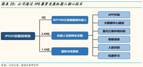 发展机器人互联网生态圈,提升产品智能化程度:公司拟将通过IPO募集的2.69亿资金投入“机器人互联网生态圈”的打造,通过APP和大数据等技术领域的持续研发,满足用户从产品到服务的全方位个性化需求,不断完善服务机器人“物联网”体系,提升服务机器人产品在环境识别、人机交互、深度学习等方面的智能化程度。