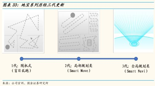 后续技术的进步特别是多传感器融合,算法升级带动扫地机器人在功能、质量和智能化水平上飞跃式的发展。功能型痛点的问题,如清洁功能不到位、路线规划、物体识别、费时耗电等问题,事实上都是传感器的原理和算法不同带来的。特别是第一代随机类产品,主要依靠撞击物体边缘来随机规划路径,没有路径规划功能,清扫覆盖率低,实用性很较差,没办法检测缠绕,没办法记忆地图,没办法检测地毯和悬空,也无法设置虚拟墙。对于室内定位和复杂路径规划的需求而言,传感器提供的信息尚显不足。而传感器和算法原理和机电系统的不断进阶决定了清扫范围和清洁程度的差异。传感器的进阶从红外传感器、接触式传感器、超声波传感器到激光雷达传感器,而算法决定了产品的智能程度。这两者的进步带来的直接影响是,扫地机器人的产品从第一代随机式导航(随机类产品)到第二代产品陀螺仪+加速度计导航、惯性导航、(局部规划类产品),到第三代产品LDS激光测距传感器、V-SLAM图像位移定位(全局规划产品)。拥有导航系统的扫地机器人可以在工作过程中,尽量做到清扫面积全覆盖且行走路径不重叠,依据某个或某些优化准则进行最优路径规划。