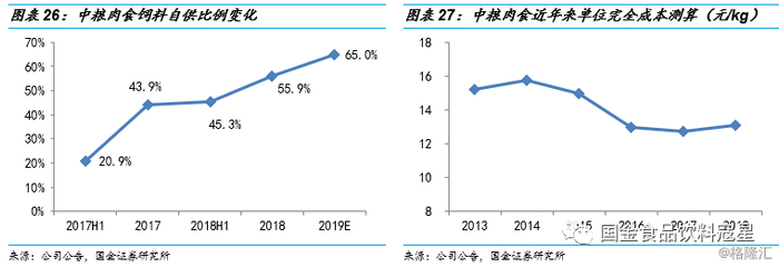 单位养殖成本远低于行业平均水平,未来仍有进一步下降空间。经过我们测算,2018年中粮肉食的生猪养殖完全成本约为13元/公斤,与温氏股份、牧原股份等养殖龙头相差不大,且远低于行业平均养殖成本(自繁自养约14.57元/kg),在行业中仍处于较低水平。成本端具体来看,生猪养殖成本中包括饲料成本、生物资产(母猪)和固定资产折旧、医药疫苗、人工成本以及死淘成本等。目前中粮肉食的折旧成本相对较高,主要是由于公司饲养成本较高,且自繁自养模式下育肥场的折旧较高,随着未来“公司+农户”合作养殖模式的逐步推进,预计折旧成本将会有所下降。另外,公司饲料自给比例在未来有望进一步提升(2018年底为55.9%,19年有望达到65%),可进一步节约饲料成本。我们认为,公司未来养殖成本仍有进一步下降的空间。