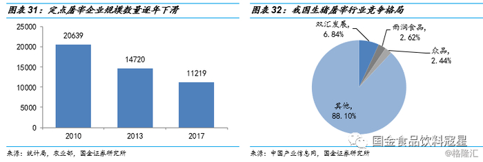 屠宰行业格局过于分散,行业集中度仍有待提升。随着1998年国家开始施行定点屠宰制度,尤其是2009年生猪屠宰管理条例修订之后,我国生猪屠宰进入新的发展阶段,中小屠宰企业加速出清,数量大幅减少。2010年,全国共有生猪定点屠宰企业20639个,较1998年实施定点屠宰制度前减少了80%,2017年进一步下降到11219家,降幅达到45.6%。而规模定点企业数量稳步增加,“十二五”规划末期,全国规模以上屠宰企业为2837家,比“十一五”末增长17.9%,屠宰量占比达到68%。虽然规模企业屠宰量占比有所提升,但整体而言,我国屠宰行业集中度仍然偏低。从农业部发布的定点规模企业屠宰量来看,2017年双汇和雨润的屠宰量占比分别为6.84%和2.62%,CR2也只有9.46%,仍然处于较低水平。
