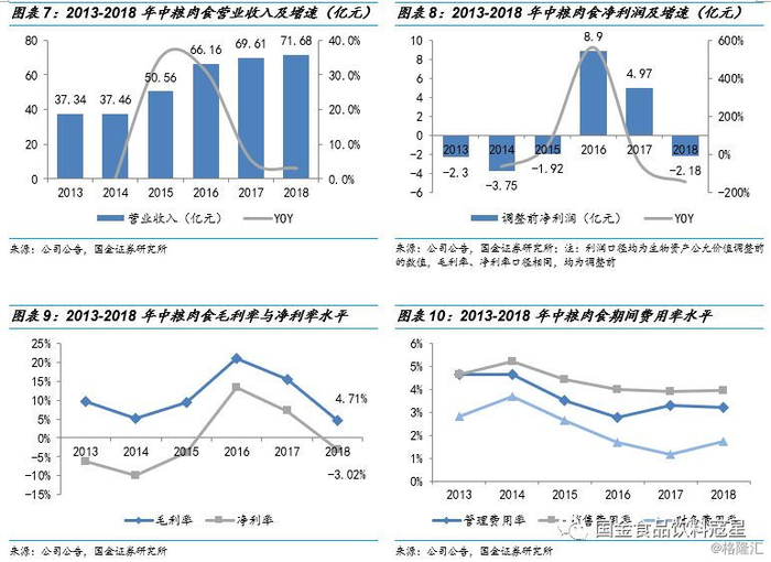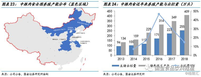 “自繁自养+合作养殖”双轮驱动,养殖产能不断扩张。生猪养殖业务一直是中粮肉食最主要的收入、利润来源(2018年受猪价影响,生猪养殖业务部业绩相对较差),近年来公司养殖产能在不断扩张。截至2018年底,公司在江苏、湖北、内蒙、吉林、河北、河南以及天津等地共拥有数十家养殖场,产能合计408.9万头,同比增长17.1%。从出栏量来看,2018年公司共出栏255万头,同比增长14.56%,在行业内排名第四。考虑到生猪养殖产能从养殖基地建成到释放约需要2年(从空栏、补充能繁母猪、怀孕、产子、育肥和新一轮补充母猪到满栏),因此我们预计2019、2020年公司生猪养殖产能将会进一步释放。目前公司的养殖模式主要为自繁自养,为加快养殖产能建设,未来产能扩张会采用“自繁自养+合作养殖”双轮驱动的模式。与自繁自养相比,“公司+农户”的养殖模式避免了较大的土地支出以及环保政策的限制,同时还可以较快出栏,加速产能的释放。2018年公司合作养殖顺利开展,在上半年已投放猪苗8.4万头,并结合政府“精准扶贫”政策,探索多种扶贫合作养殖模式。我们认为,公司在猪价下行周期内仍在储备养殖产能养精蓄锐,未来有望通过合作养殖进一步扩大养殖规模,产能释放蓄势待发。