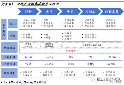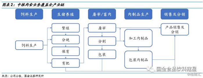 生猪产业链主要包括以下五个环节:饲料生产、生猪养殖、屠宰加工(生鲜猪肉)、肉制品加工、销售,不同的企业对于产业链的布局不同,主要分为三种类型。第一类重点布局上游生猪养殖行业,如温氏股份、牧原股份,这些企业以生猪养殖起家,在育种和育肥上有着丰富的经验积累,技术优势与成本优势突出。第二类重点布局下游的屠宰加工与肉制品加工,如双汇发展,屠宰产能规模较大,肉制品加工经验丰富,且渠道多样。第三类采用全产业链布局,如中粮肉食,业务范围涵盖从上游养殖至下游屠宰与销售。三类相对比来看,对上游生猪养殖企业来说,下游生鲜猪肉业务渠道成本较高,对消费者而言知名度不高,品牌推广难度较大;而下游肉制品企业由于没有自己的生猪养殖场,食品安全无法严格保证,同时要自建规模化生猪养殖场的难度也比较大。全产业链布局式有助于平滑猪价对收入端的影响,保证生鲜猪肉产品质量稳定的同时发展品牌业务,获得产品溢价,进一步提升产品利润率,产业链垂直整合逐渐成为行业发展趋势。