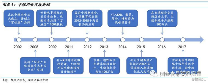 中粮肉食前身为中粮集团注册成立的武汉中粮肉食,于2002年正式成立,在湖北地区开展生猪全产业链业务,并创立“家佳康”品牌用以销售品牌生鲜猪肉以及肉制品。2009年中粮肉食投资有限公司正式成立,并于同年收购万威客食品有限公司100%股权,在华南开展肉制品业务,全产业链业务进一步拓展。2012年,公司被国家体育总局指定为中国奥运体育代表团2012-2015年唯一肉类食品供应商。2016年11月,中粮肉食于港交所成功上市,并于2017年入选恒生系列指数。发展至今近20年,公司专注食品安全,目前已成为我国猪肉市场最重要的运营商之一。