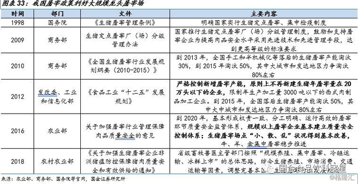 屠宰政策进一步向大规模龙头屠宰场倾斜。从1998年国务院颁布《生猪屠宰管理条例》起,政策不断向大中型屠宰企业倾斜,促使落后生猪屠宰产能淘汰。2012年《食品工业“十二五”发展规划》提出严格控制新增屠宰产能,原则上不再新建生猪年屠宰量在20万头以下的企业,限制年生产加工量3000吨以下的西式肉制品加工企业。到2015年,全国手工和半机械化等落后生猪屠宰产能淘汰50%,其中大中城市和发达地区力争淘汰80%左右。2016年起,环保督查亦促使不符合污染防治标准的落后屠宰产能淘汰。政策层面的倾斜将加速小型屠宰场的退出,利好大型屠宰场的发展。