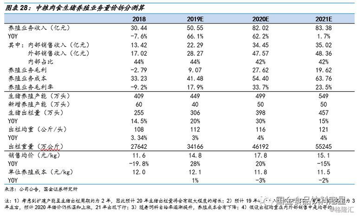 (1)产能扩张+养殖模式驱动+猪价上行,生猪养殖业务有望实现量价齐升。截至2018年底,中粮肉食生猪养殖产能为408.9万头,19年公司将持续扩张产能,预计19年养殖产能将达到450万头。另外,随着“公司+农户”养殖模式的推进,生猪出栏速度加快,叠加17/18年新建产能的释放,19年生猪出栏量有望得到大幅提升。行业角度来看,猪瘟加速产能出清导致能繁母猪存栏量明显下降,这将直接影响到2019/2020年生猪行业供应量,未来在供应偏紧的情况下,猪价将大概率回升。产能释放叠加猪价上涨,业绩弹性十足。