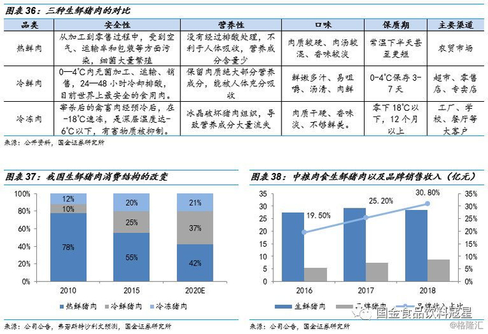 伴随消费升级,猪肉消费逐渐趋向低温化与品牌化。我国生鲜肉主要包括冷鲜猪肉、冷冻猪肉和热鲜猪肉三个类型,冷鲜猪肉主要在以超市和大卖场为主的现代零售商、零售专门店中销售,屠宰后猪肉经过快速冷却,在其后的加工与流通过程中,始终处在0-4℃冷链下保存。因此,冷鲜肉在营养价值和食品安全度方面均优于热鲜肉。2008年我国猪肉消费结构中,冷鲜猪肉消费占比不到10%,2015年占比超过20%,结构变化显著,据弗若斯特沙利文预测数据,至2020年冷鲜猪肉占比将达到37%。另外,在消费升级的推动下,品牌成为消费者在购买生鲜猪肉时考虑的重要因素,尤其是在非洲猪瘟的背景下,品牌生鲜更值得消费者信赖。另外,从企业角度来看,品牌猪肉能取得较高的溢价,有助于屠宰厂商平抑猪价波动带来的风险,平滑毛利率,增强盈利能力。
