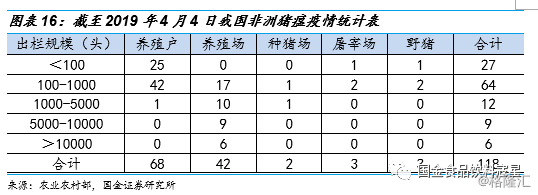 据农业农村部数据显示,截至2019年4月4日,在公告的118起非洲猪瘟案例中,68起发生在养殖户中,44起发生在规模化养殖场以及种猪场中;从出栏量规模维度来看,出栏1000头以下的养殖户/养殖场共发生91起,而出栏规模在10000头以上的大规模养殖场中仅发生6起。从以上数据统计可以发现,非洲猪瘟疫情感染风险最大的是生猪养殖散养户(规模500头以下),其次是中小规模化养殖场。
