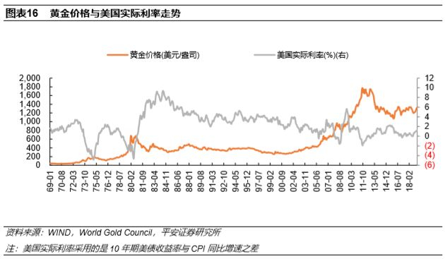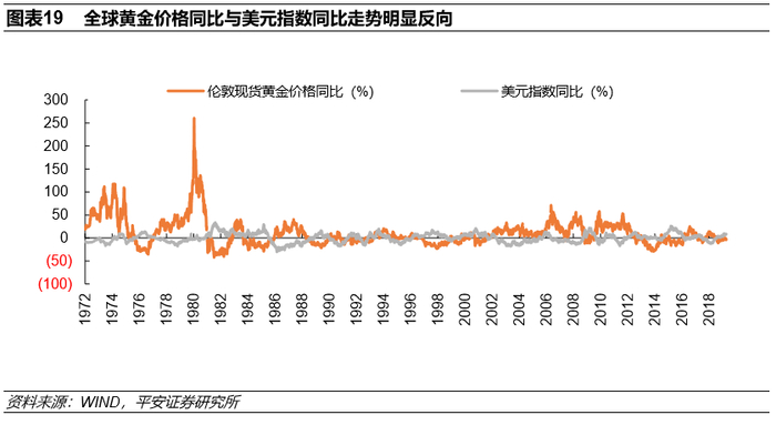 另外,全球黄金价格与实际利率的关系也可以反映黄金价格和通货膨胀的关系。因为通胀上行会带来实际利率的回落,另外,央行对基准利率的调节往往是为了控制通胀在某一中枢水平,而基准利率往往会导致实际利率同向变动。因此,黄金价格抵御通胀也会反映为金价与实际利率的负相关性。从1969-2019年期间全球黄金价格和美国实际利率的走势看,两者的负相关关系还是很明显的,相关系数为-0.26,验证了两者的负相关性。采用剔除通胀的黄金实际价格与10年期美债收益率或10年期TIPS实际收益率也能得出类似的结论。