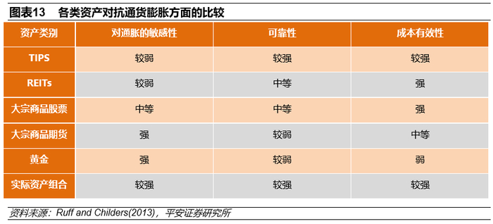目前学界并未就金价抵御通货膨胀的能力与稳定性达成一致意见。虽然实证检验大多支持黄金能够抵抗通货膨胀,但反对者主要认为房地产信托投资基金(REITs)、大宗商品供应商的股票及与通胀率挂钩的国债(TIPS)在规避通胀方面有更好的效果,不仅收益更高,而且成本更低。另外,黄金与通货膨胀率之间的关系并不稳定。1985年之后,黄金价格与通货膨胀率之间并没有明显的相关性,但在20世纪70年代,通胀大幅上升期间金价也大幅上升,说明黄金价格在抵御通胀突然大幅上升方面更为有效,这也是金价对通胀强敏感性的体现。